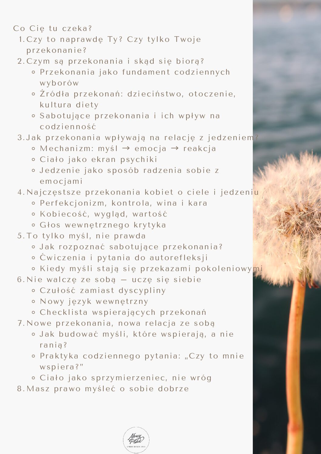 W pracy psychodietetycznej zauważyłam, że największą zmianę przynosi nie dieta, nie lista zakazów, ale zmiana sposobu myślenia. Przekonania, które nosimy – o jedzeniu, o sobie, o ciele – mają ogromny wpływ na nasze codzienne wybory. A kiedy zaczynamy je dostrzegać, rozbrajać, zastępować – coś się zmienia. W głowie. W ciele. W emocjach.